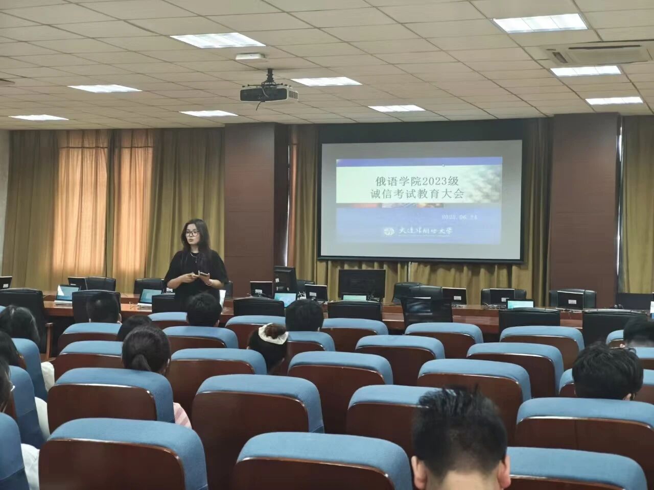 随着期末考试及假期的到来,为了进一步加强俄语学院学生安全、诚信教育,确保每位同学都能安全、有序地度过期末及假期,同时坚守诚信本质,营造公平公正的考试氛围,本周俄语学院各年级召开期末年级大会,年级大会由辅导员王健老师、美合日古丽·喀哈尔老师主持,三个年级的全体同学参加。
