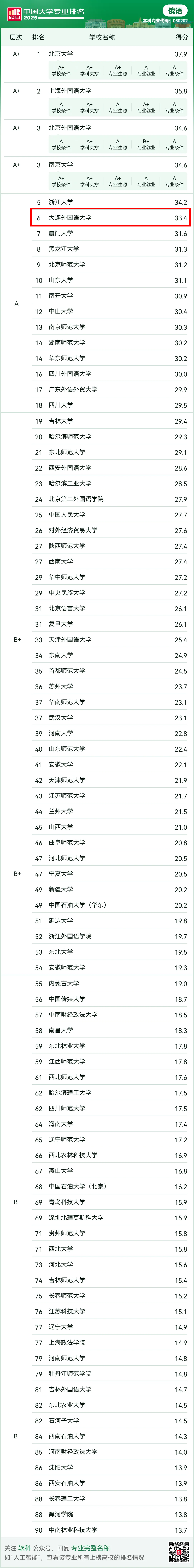 2025年6月18日,高等教育专业评价机构软科正式发布了“2025软科中国大学专业排名”。在此次排名中,我院俄语专业获评“A”级专业。在参与评选的90所院校中,我校俄语专业排名较2024年上升了一位,位列第6名,得分为33.4。